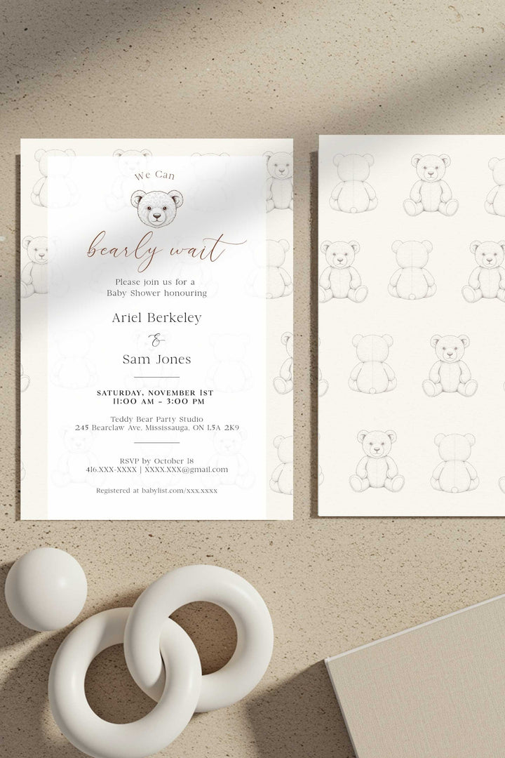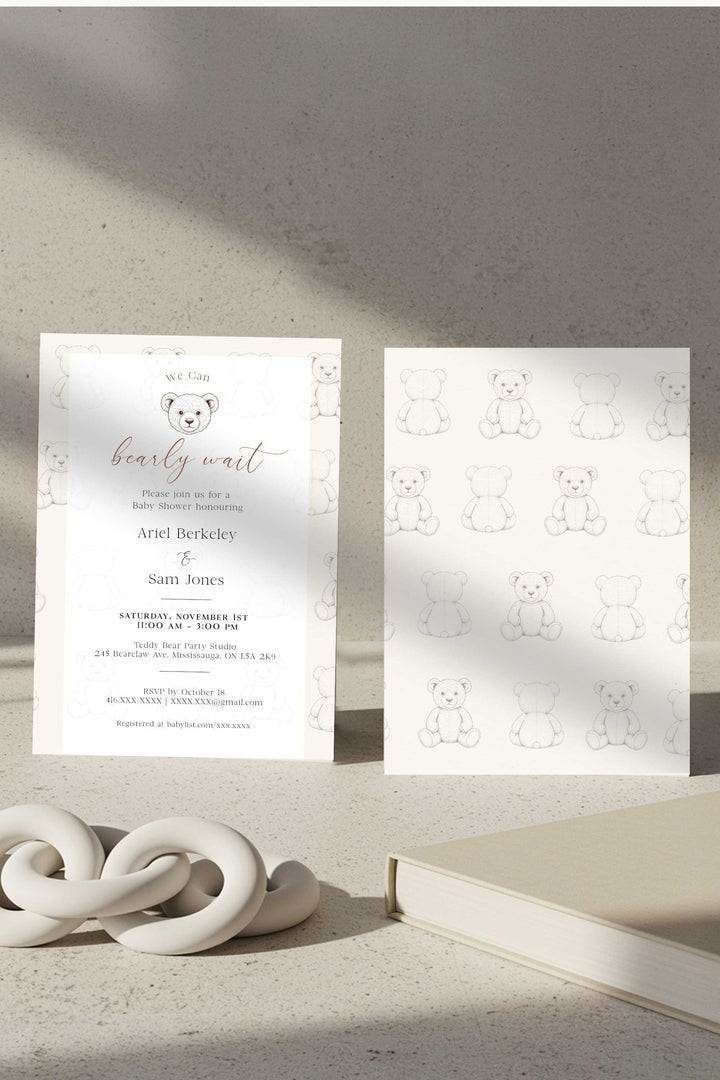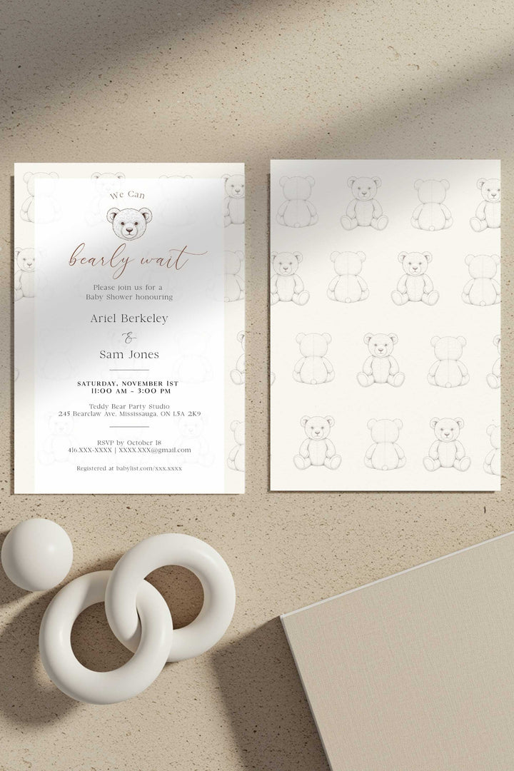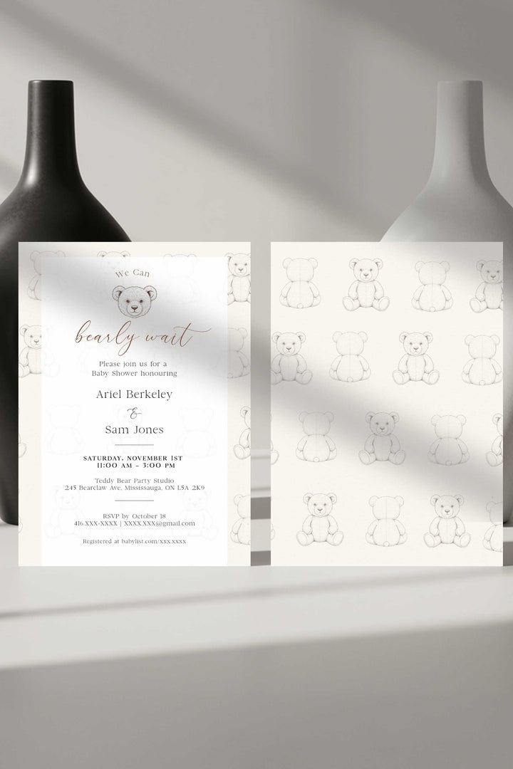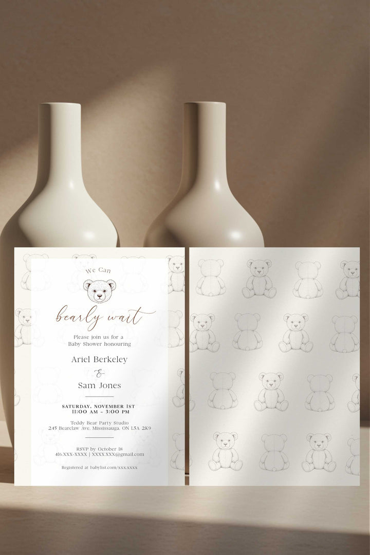 The Bearly Wait Baby Shower Invitation – Double-Sided Teddy Bear Template features a hand-drawn teddy bear on the front with a coordinating patterned backer. This gender-neutral baby shower invitation is editable through Templett and printable two per sheet, making it an easy and affordable choice for rustic, woodland, or minimalist themes.