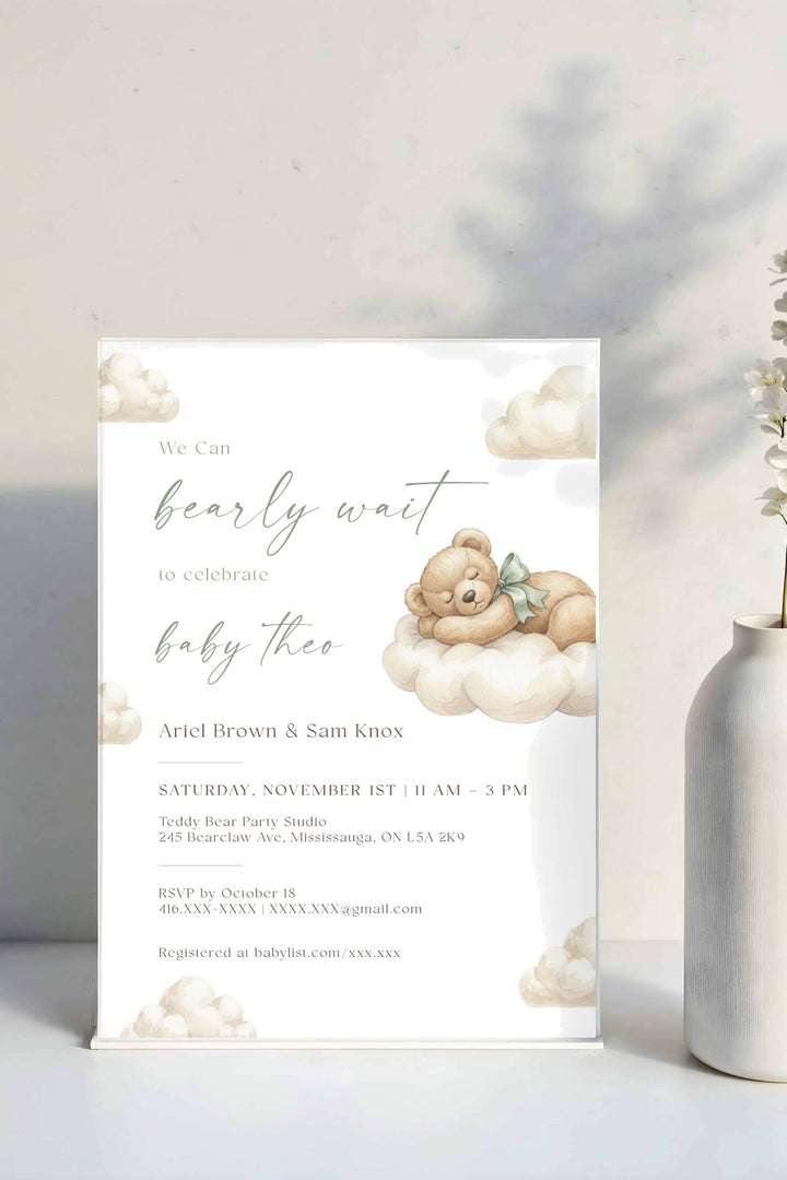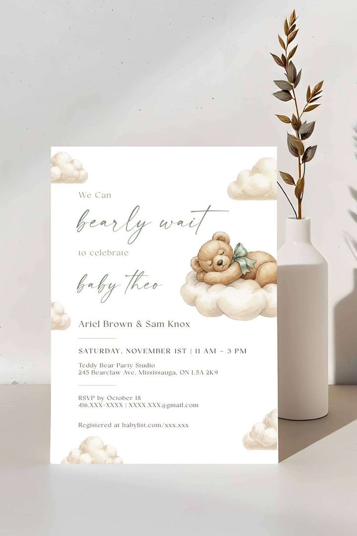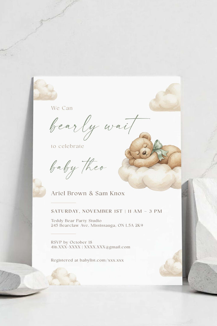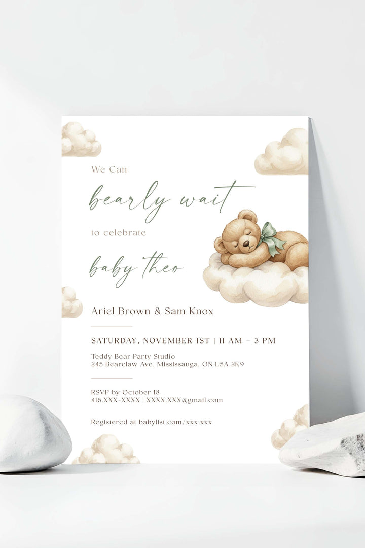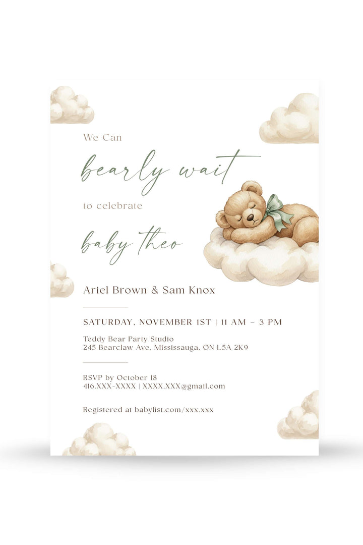 The Bearly Wait Baby Shower Invitation – Gender Neutral Printable Template is a sweet watercolor design featuring a teddy bear resting on soft clouds. Perfect for celebrating baby boys, girls, or surprise genders, this editable template creates a timeless look for your shower.