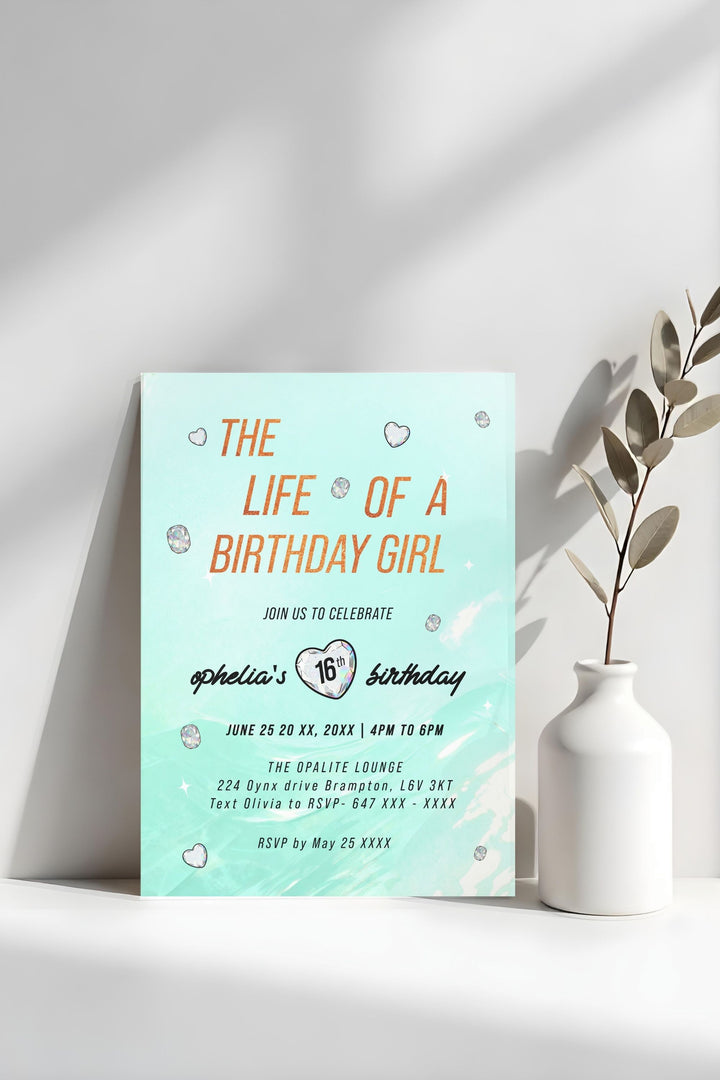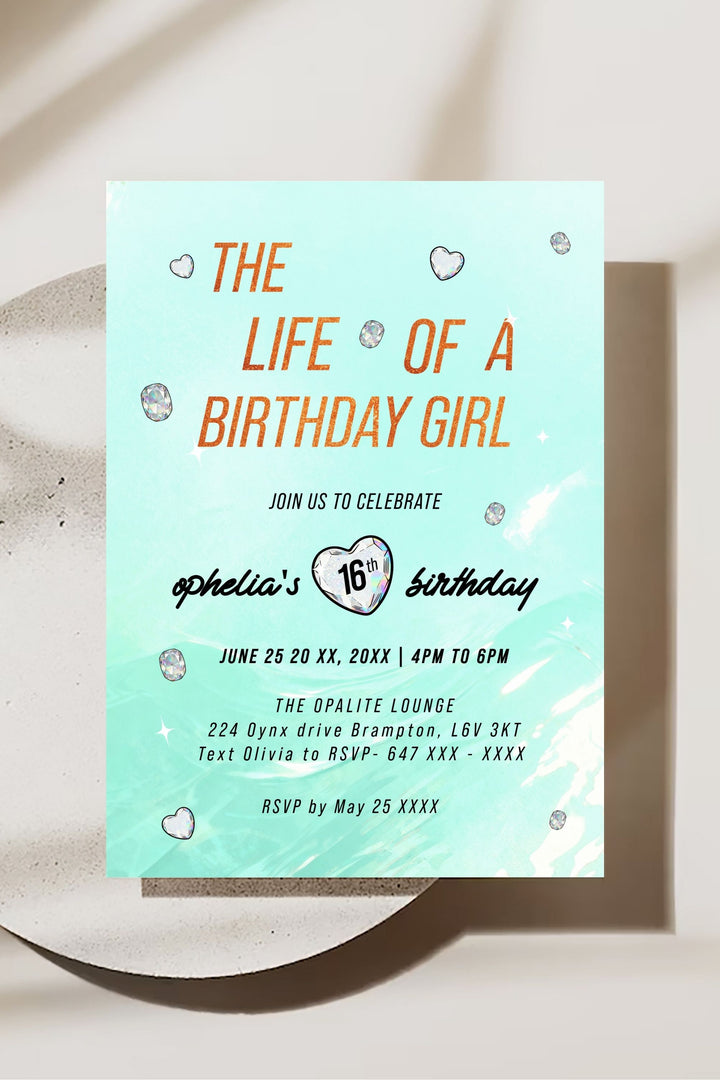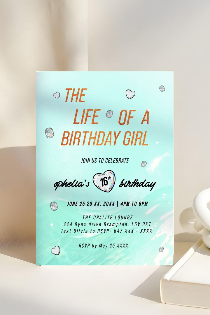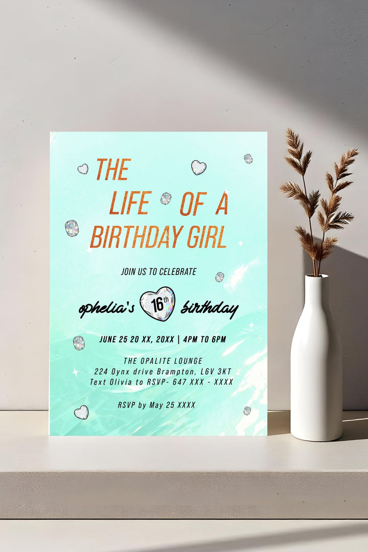 Kick off your Swiftie Show Girl Era with the Life of a Showgirl Birthday Girl - Taylor Swift Birthday Invitation, created for fans who want to bring Taylor-inspired energy to their celebration. Featuring teal and orange tones with radiant opalite gem accents, this editable invitation combines bold, era-inspired typography with a clean, modern layout — perfectly capturing the glamorous, showgirl aesthetic of Taylor Swift’s The Life of a Showgirl album.